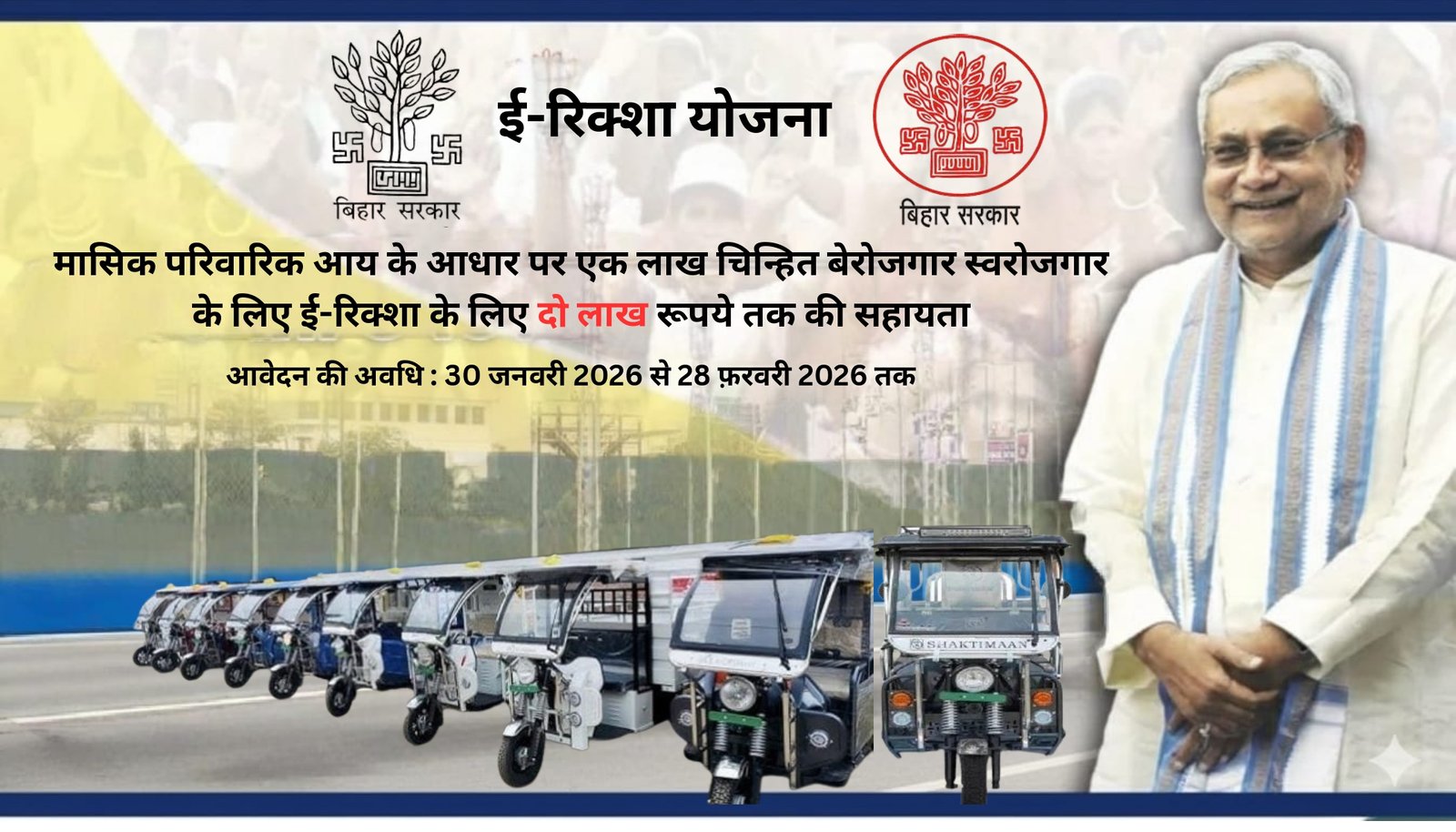 राज्य में स्वरोजगार को प्रोत्साहित करने, बेरोजगारी को कम करने तथा पर्यावरण के अनकुल परिवहन व्यवस्था को बढ़ावा देने के उद्देश्य से उद्योग विभाग, बिहार सरकार द्वारा एक नई योजना बिहार ई-रिक्शा सहायता योजना 2025-26, से प्रारम्भ की जाती है। इस योजना के अन्तर्गत राज्य के गरीब, बेरोजगार एवं आर्थिक रूप से कमजोर वर्ग के पात्र एक लाख व्यक्तियों की बैटरी द्वारा संचालित ई-रिक्शा क्रय करने हेतु आर्थिक सहायता /अनुदान प्रदान किया जायेगा, जिससे वे स्वरोजगार स्थापित कर अपनी आजीविका सुनिश्चित कर सकें।